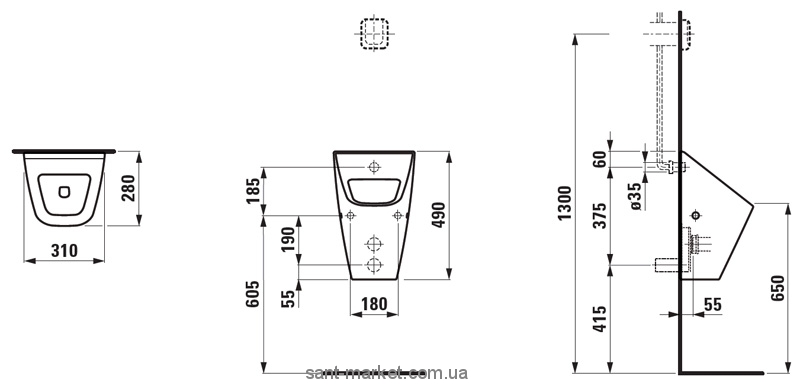 Laufen Vila 88411420000001 - підвісний пісуар із прихованим підведенням води. Виготовлений із високоміцного матеріалу - кераміка. Колір білий. Випуск води у пісуарі горизонтальний.