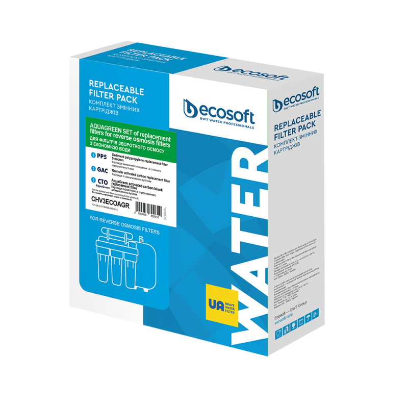 У комплект входять три картриджі Ecosoft, необхідні для підготовки води перед мембранним елементом у домашньому фільтрі з технологією зворотного осмосу. У комплект входять два вугільнікартриджа, тому він підходить для води з високим вмістом хлору.