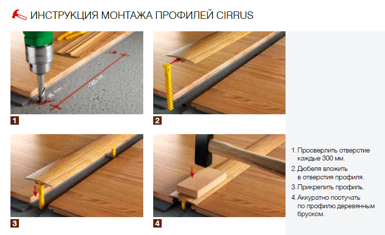 До порогам відносяться дві групи: профілю виконані з ПВХ - Cirrus і алюмінію - Stratus. Профілю Cirrus і Stratus застосовуються для з'єднання різних поверхонь. Естетична обробка при з'єднанні підлог виконаних з різних матеріалів, наприклад кахлю, ковроліну, паркетуабо ламінату. З'єднують підлоги на однаковому і на різному рівні. Завдяки цьому пороги можуть залишатися непомітними, а також додатково підкреслювати з'єднання поверхонь.