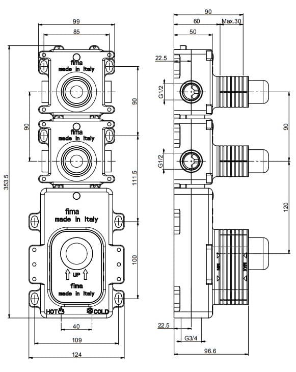 - простий монтаж з нижніми паралельними впускними отворами на G ¾ ", Вихідніотвори на G 1/2" справа і зліва