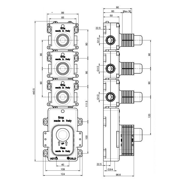- простий монтаж з нижніми паралельними впускними отворами на G ¾ ", Вихідніотвори на G 1/2" справа і зліва