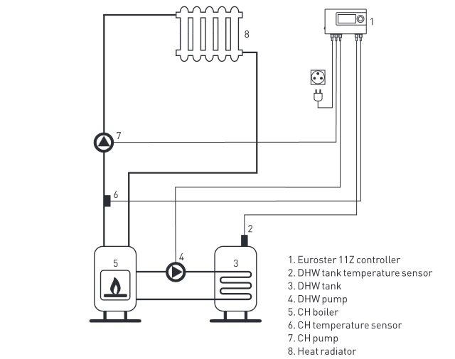 Euroster 11Z - це програмований контролер для одночасної взаємодії з циркуляційним насосом центрального опалення та насосом, що заповнює бак гарячої води для побутового споживання - економічне рішення у разі необхідності використання двох насосів в автономних системахцентрального опалення та в системах гарячого водопостачання. газ. У системі ГВП контролер підтримує постійну температуру води в баку або системі гарячого водопостачання з пріоритетом завантаження бака або без неї. Euroster 11Z оснащений системою захисту насоса Anti Stop, яка запобігає заклиненню невикористаного робочого колеса насоса. Після закінчення опалювального сезону система автоматично запускає насос кожні два тижні на 30 секунд (щоб система працювала після сезону, контролер слід залишити увімкненим).