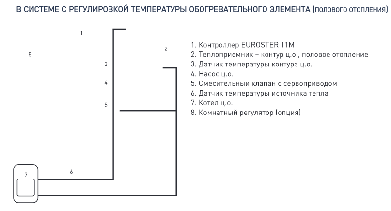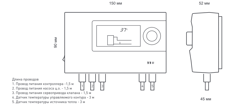 - Пристрій призначений для роботи з триходовим клапаном із серводвигуном та циркуляційним насосом центрального опалення (серводвигун змішувача має бути оснащений кінцевими вимикачами).