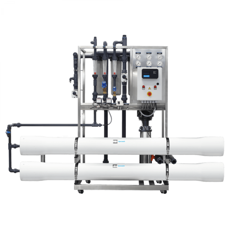 Вода, що надходить в систему зворотного осмосу, проходить попереднє очищення на картриджних фільтрах тонкого очищення 5 мкм, що входять в комплект установки. На мембранний модуль вода подається насос високого тиску. У робочому режимі у мембранному модуліустановки відбувається поділ води на два потоки: демінералізовану воду - пермеат і воду з підвищеним вмістом солев - концентрат. Частина концентрату під час роботи модуля скидається в каналізацію, частина направляється на вхід насоса високого тиску, забезпечуючи так званий рецикл концентрату. У потік вхідної води може дозуватися антискалант, що перешкоджає утворенню відкладень усередині мембранних елементів. Демінералізована вода (пермеат) надходить у накопичувальний бак пермеату, в якому встановлено датчик рівня, що відключає установку при заповненні бака. Установка перед вимкненням або із заданою періодичністю автоматично промивається вихідною водою.Наведений режим називається режимом гідравлічного промивання, при цьому на установку короткочасно протягом 1-2 хвилин подається вода, що перевищує подачу в робочому режимі.