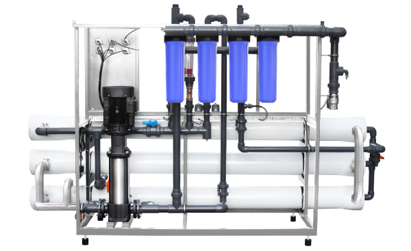 Вода, що надходить в систему зворотного осмосу, проходить попереднє очищення на картриджних фільтрах тонкого очищення 5 мкм, що входять в комплект установки. На мембранний модуль вода подається насосомвисокого тиску. У робочому режимі в мембранному модулі установки відбувається поділ води на два потоки: демінералізовану воду - пермеат і воду з підвищеним вмістом солев - концентрат. Частина концентрату під час роботи модуля скидається в каналізацію, частина направляється на вхід насоса високого тиску, забезпечуючи так званий рецикл концентрату. У потік вхідної води може дозуватися антискалант, що перешкоджає утворенню відкладень усередині мембранних елементів. Демінералізована вода (пермеат) надходить у накопичувальний бак пермеату, в якому встановлено датчик рівня, що відключає установку при заповненні бака. Встановлення перед вимкненням або із заданоюперіодичністю промивається автоматично вихідною водою. Наведений режим називається режимом гідравлічного промивання, при цьому на установку короткочасно протягом 1-2 хвилин подається вода, що перевищує подачу в робочому режимі.