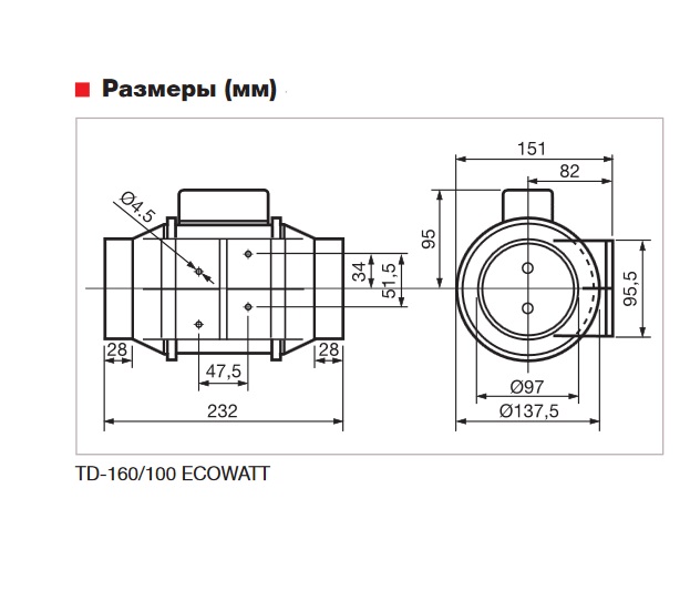 1) Промисловий вентилятор Soler&Palau TD-160/100 Ecowatt канальний малошумний