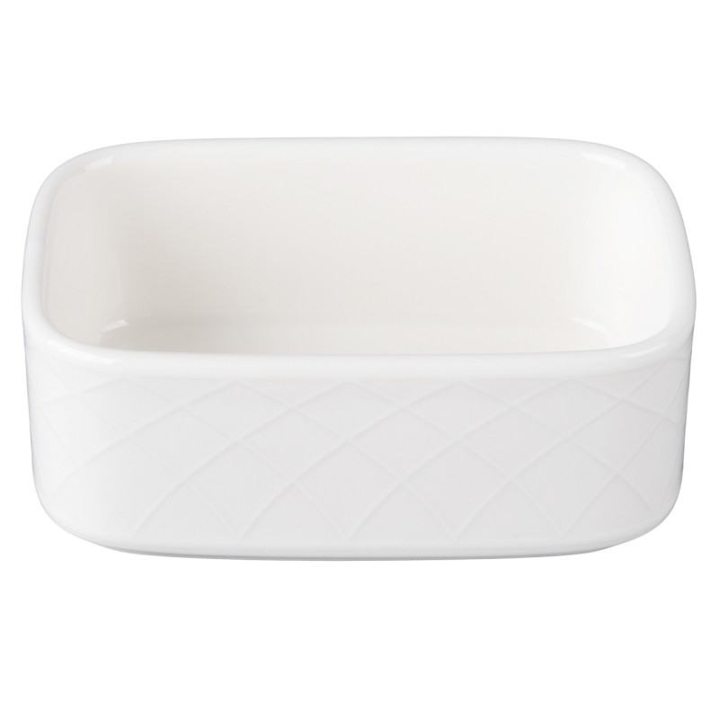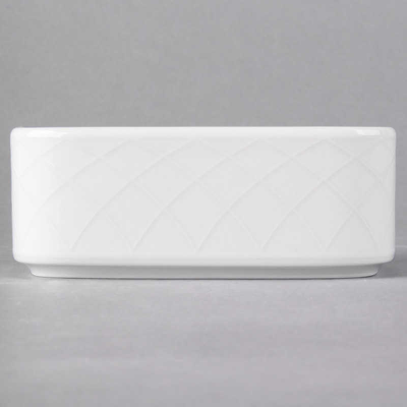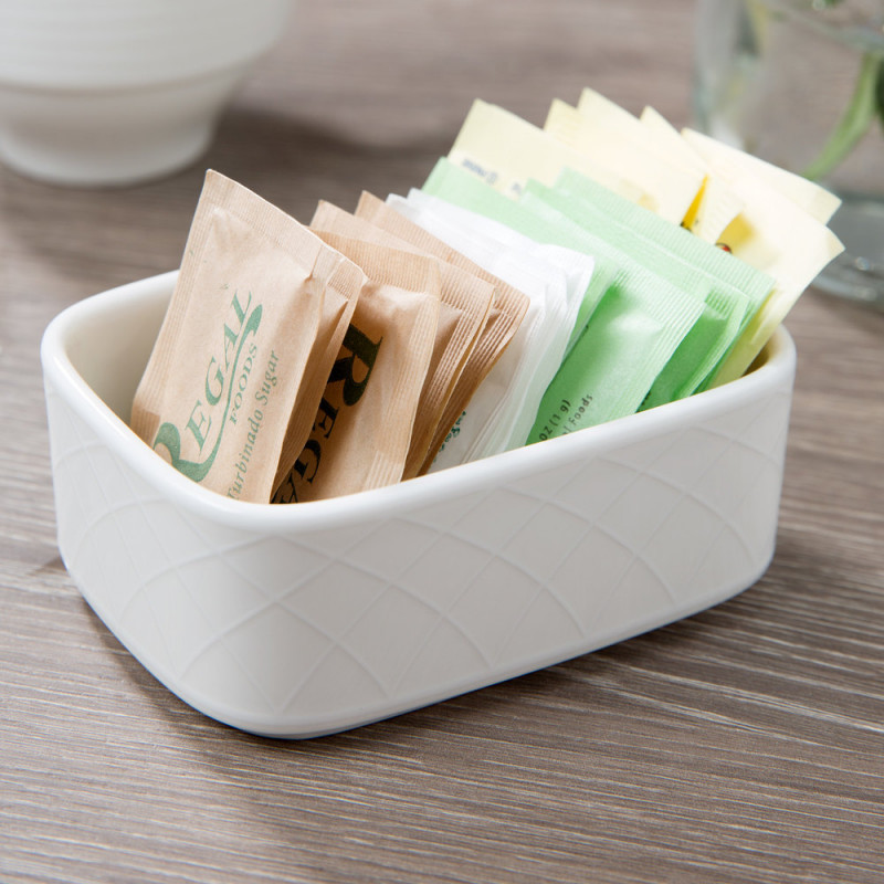 Надайте елегантності і витонченості цієї моделі цукорниці для пакетів з білого фарфору. Цей предмет свіжого білого кольору є професійним і привабливим рішенням для сервірування вашого ресторану, готелю або обіднього залу заміського клубу. Його простий силует і колір створюють контраст, дозволяючи вашим яскравим свіжим страв стати центральним елементом будь-якої обідньої зони. Використовуйте цю прямокутну цукорницю, щоб надати цукор в індивідуальній упаковці для підсолоджування гарячих і холодних напоїв. Цей предмет прикрашений привабливим перекрещивающимся візерунком, який забезпечує тонку,елегантну деталізацію, додаючи візуальний інтерес до вашої настільної презентації. Подавайте його окремо або поєднуйте його з іншою частиною колекції Bella для привабливою і професійної презентації.