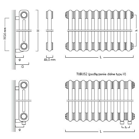 Радіатор є сталевим трубчастим опалювальним приладом зібраним із секцій шириною 46,5 мм, з'єднаних зварним методом, покритий високотехнологічним полімерним покриттям з попередньої багатоступінчастої обробкою. Максимальна кількість секцій в одному приладі 45 шт.Конструкція радіатора TUBUS представляє можливість підключення як з лівого, так і з правого боку. Радіатори TUBUS виробляються як готові модулі з відповідним (за замовлення) кількістю ребер. Конструкція модулів не дозволяє з'єднувати або додавати окремі ребра. Радіатори TUBUS, що складаються більш ніж з 30 секцій, повинні бути підключені хрестоподібним способом. Радіатор характеризується простотою форми і високою естетикоюобробки. TUBUS безпечний в експлуатації і його легко містити в чистоті.