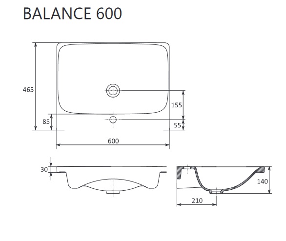 Умивальник Balance 600 не оснащений переливом, тому необхідно використовувати сифон із фіксованим зливом RAVAK. Умивальник Balance 600 встановлюється лише на тумбу для умивальника SD Balance 600.