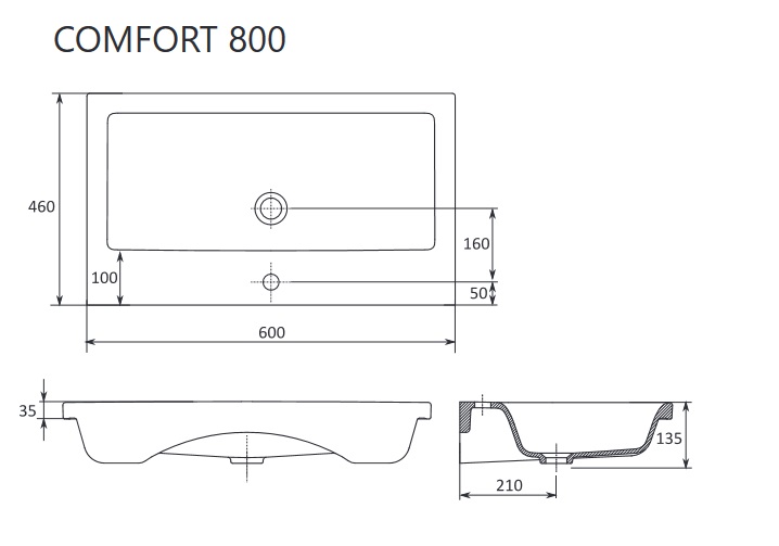 Умивальник Comfort 800 не обладнаний переливом, тому необхідно використовувати сифон для умивальника з фіксованим зливом RAVAK. Його не можна встановити окремо на стіну, тільки з тумбою під умивальник SD Comfort 800.