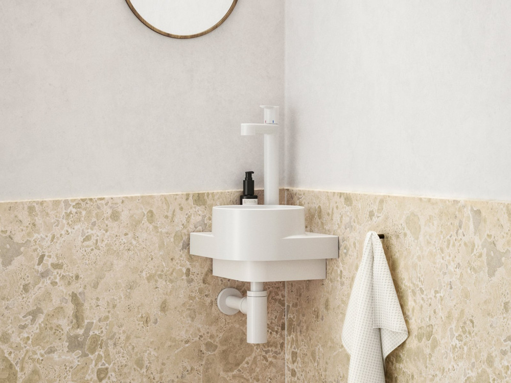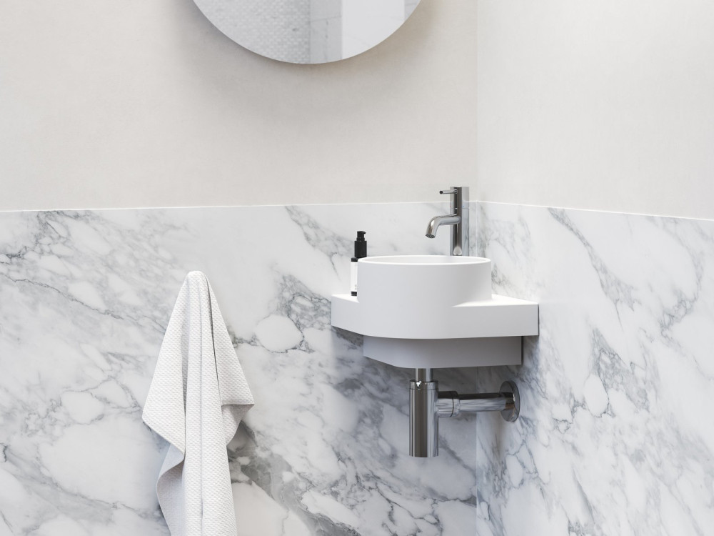 Круглий кутовий мінімальний вода доповнюється елементом конструкції у вигляді білої кронштейна, чорної або нержавіючої сталі. Магія витонченості поєднує в собі один тон поєднання кронштейна, змішувача, сифона і злив.