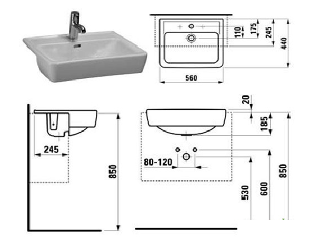 1) Раковина для ванної Laufen Pro A полувстраіваемие 56 см без отвору під змішувач білий
