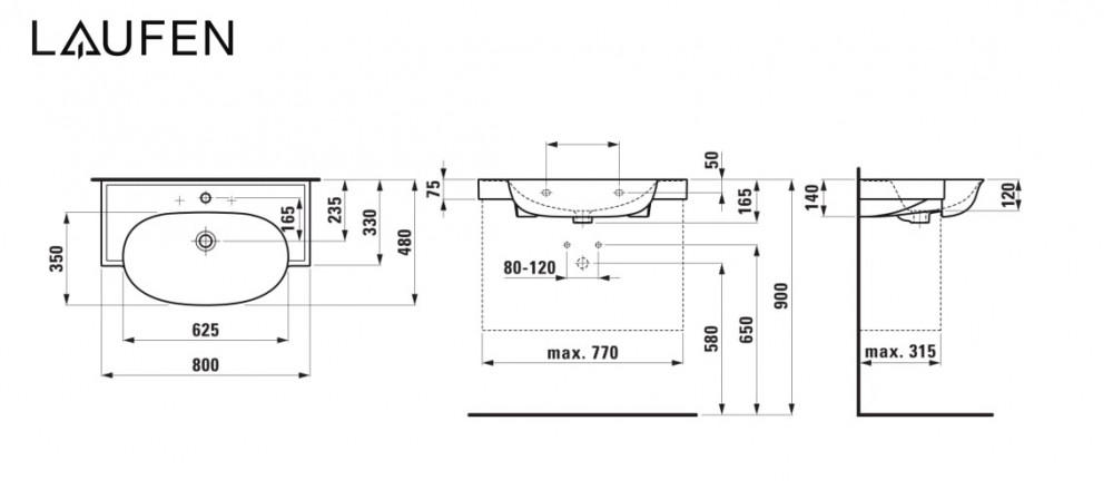 Роковина для ванної Laufen The New Classic 80х48 см з 3 отворами без переливу кераміка білий з покриттям LCC