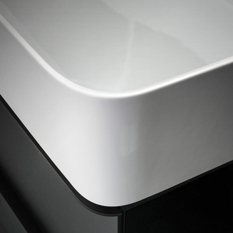 - раковини-чаші асиметричної та прямокутної форми, родзинкою яких є наявність спеціальної напівсухої зони, призначеної для зберігання невеликих предметів. Тут може розташуватися дозатор із рідким милом, крем або інші косметичні засоби