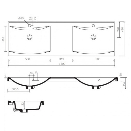 1) Раковина для ванної Marmorin Moris 1500 D врізна з крилом литий камінь білий