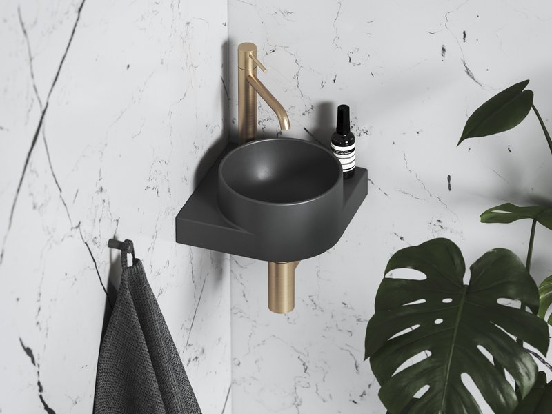 Круглий кутовий мінімальний вода доповнюється елементом конструкції у вигляді білої кронштейна, чорної або нержавіючої сталі. Магія витонченості поєднує в собі один тон поєднання кронштейна, змішувача, сифона і злив.