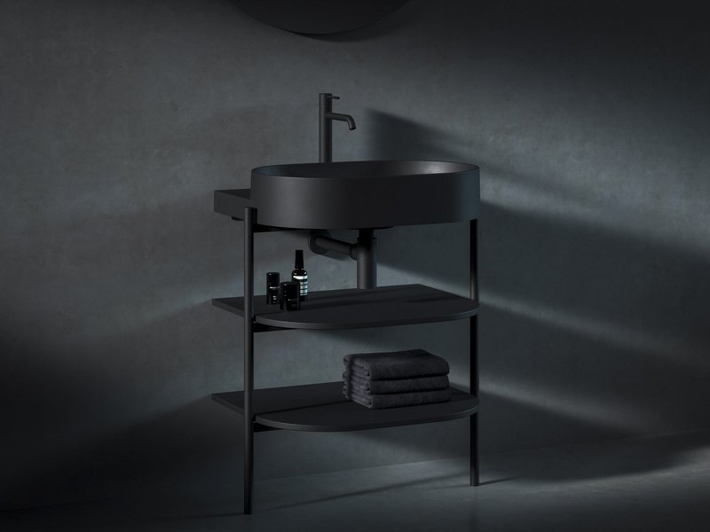 овальна мийка доповнюється елементом конструкції у вигляді білої кронштейна, чорної або нержавіючої сталі. Магія витонченості поєднує в собі один тон поєднання кронштейна, змішувача, сифона і злив.