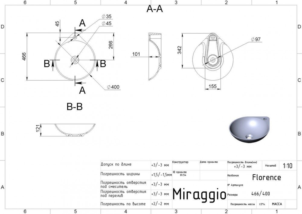 1) Раковина Miraggio Florence 46,6х40 см литий мармур білий глянцевий
