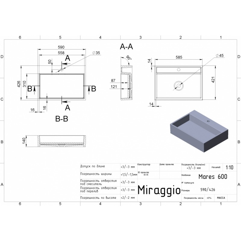 1) Раковина Miraggio Mares 58,5х42,1 см литий мармур білий глянцевий
