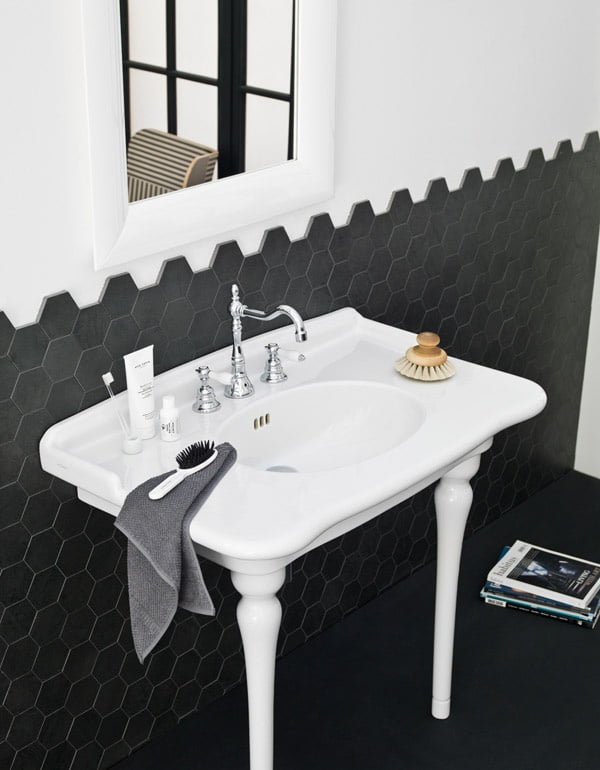 Раковина ArtCeram Hermitage повністю виконана в стилі ретро. По двох сторонах від овального поглиблення є невеликі стільниці для зручного розташування аксесуарів.