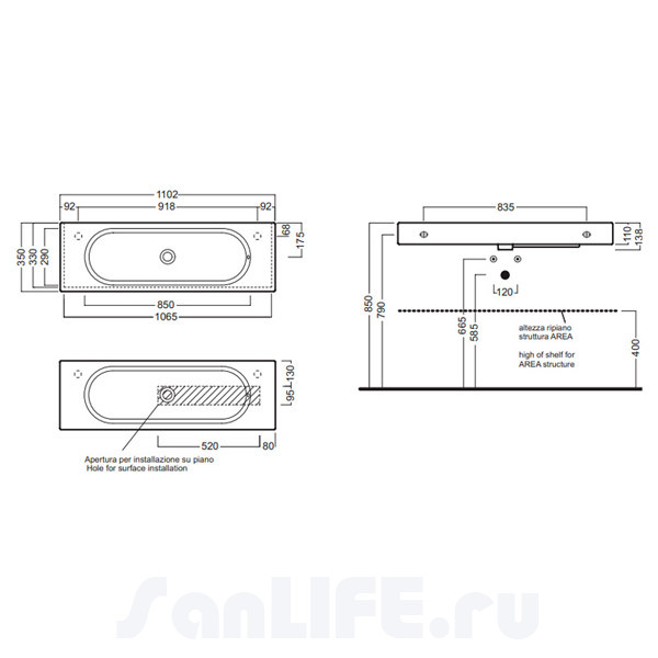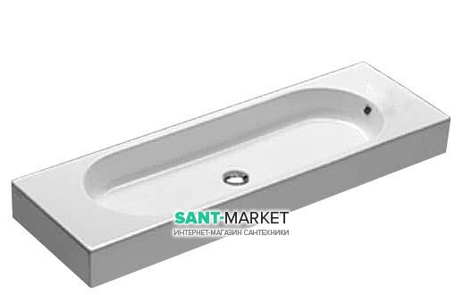 Раковина без отворів для змішувача (можливі 2 позиції для 1 отвори), розмір 110х35 см, колір білий.