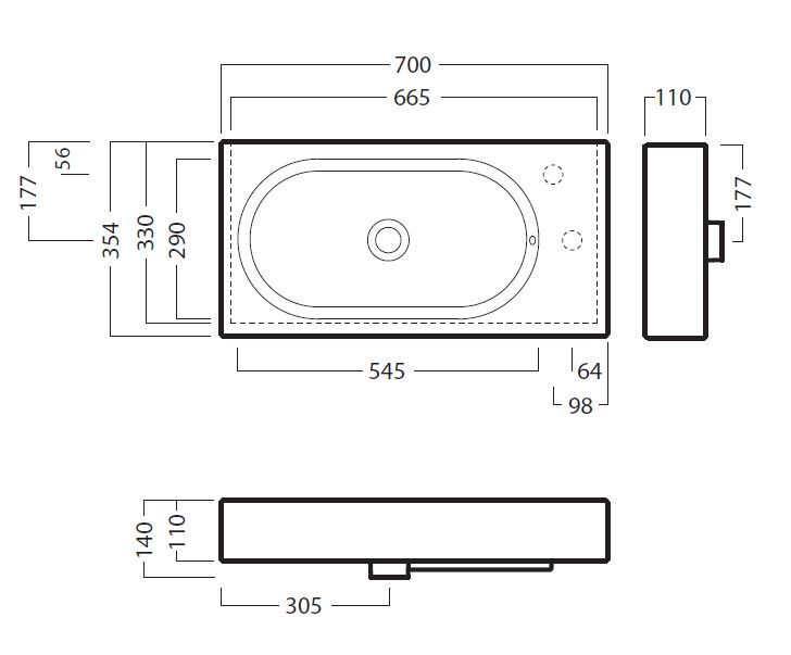 Раковина універсальна HATRIA AREA Y0W901, розмір 70х35 см, колір білий, чаша зліва. Раковина поставляється без отвору під змішувач з двома запланованими отворами. Може доповнюватися хромованим полотенцедержателем, підвісною полицею і додаткової керамічної полицею. Встановлюється на стіни за допомогою кріплення (купуються окремо), на меблі, стільниці та підстілля.