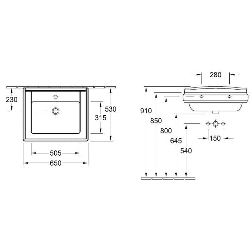 1) Раковина для ванної кімнати Villeroy & Boch Hommage підвісна 650х530 мм 1 отвір яскраво-б елий CeramicPlus