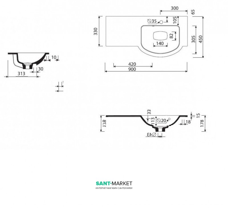 Раковина для ванної на тумбу умивальник-стільниця Marmorin Emma 90 правобічна 639 090 9xx xx x