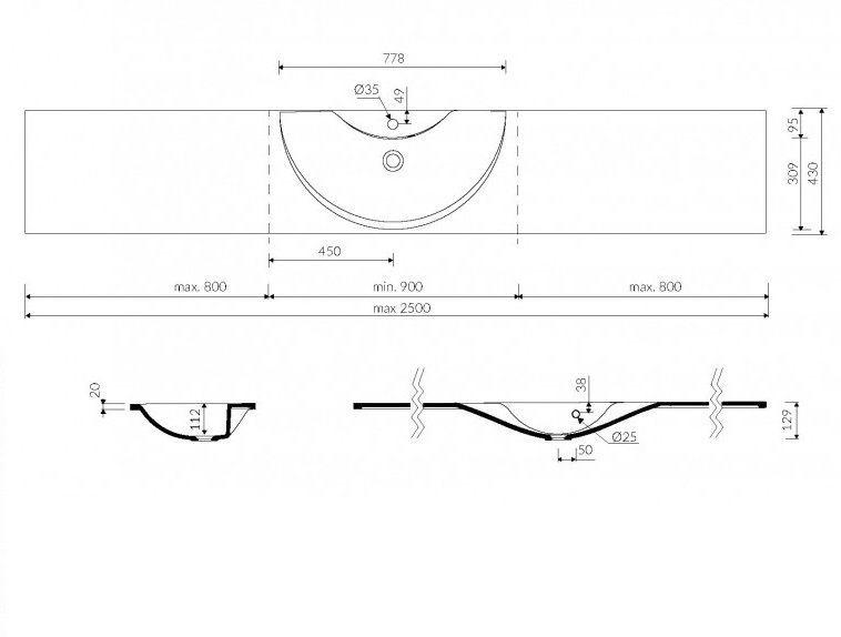 Раковина для ванної Marmorin Vera регульована від 90 до 250 см литий камінь білий 643 REG 0xx xx x