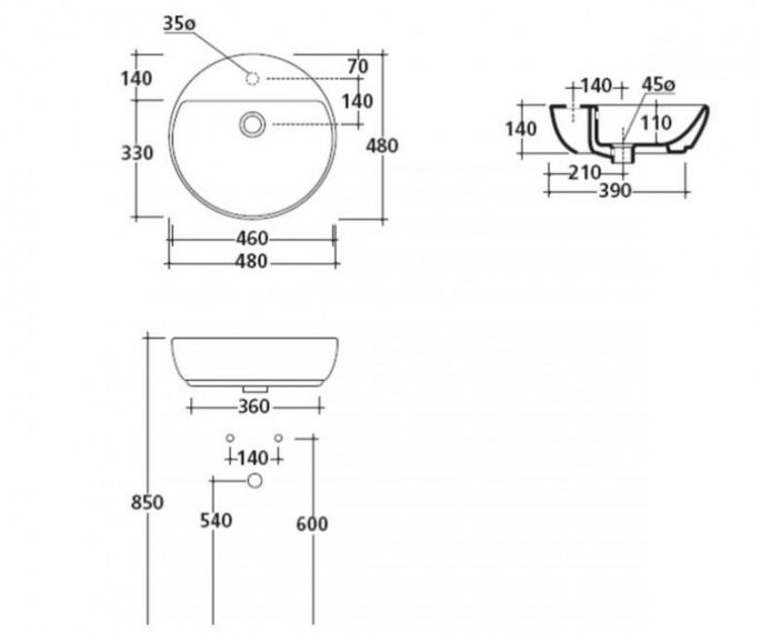 Настільна раковина діаметром 48 см встановлюється на тумбу або стільницю. Раковина має отвір під змішувач, та отвір для переливу. Рекомендується встановлювати раковину у поєднанні з високим змішувачем або змішувачем настінного монтажу.