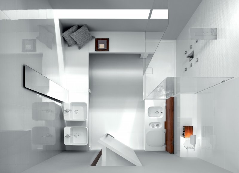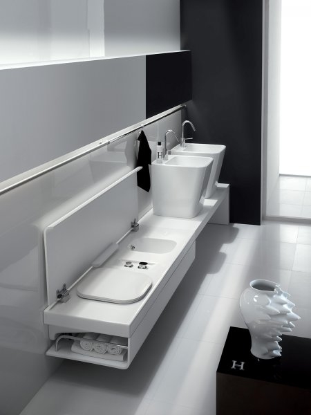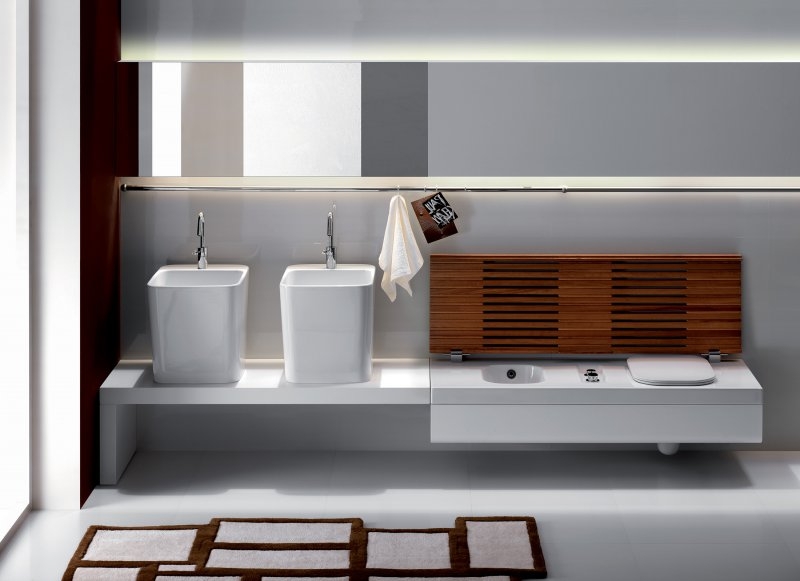 Підвісні системи від Hatria відрізняються ексклюзивним виконанням строгих прямокутних форм, бездоганною білизною і лаконічністю деталей. Це цілісні композиції, в яких гармонійно поєднуються різні форми раковин, унітазів і біде. Сантехніка монтується в одномукорпусі, система прекрасно поєднує матеріали: санфаянс високої якості і дерево.