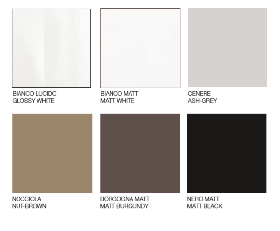 Доступні кольори в колекції: горіхово-коричневий (Nocciola), чорний матовий, бургундський матовий, попелясто-сірий (Cenere), білий матовий.