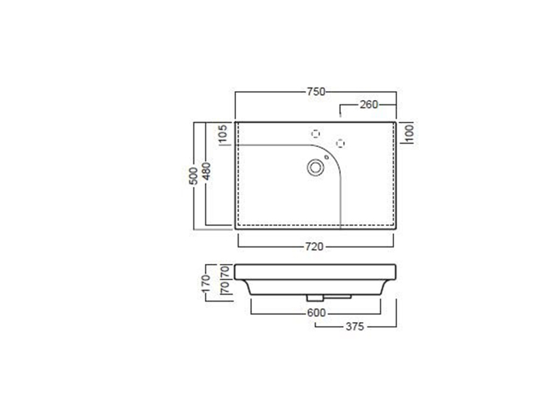 Раковина накладна HATRIA GRANDANGOLO YXEU01 з 1 отвором для змішувача, можливі дві позиції для одного отвору, чаша зліва, для установки на стільницю або тумбу, розмір 75х50 см, колір білий. Комбінуються з керамічними правими і лівими полками Grandangolo 50, вішалками для рушників і сифоном.
