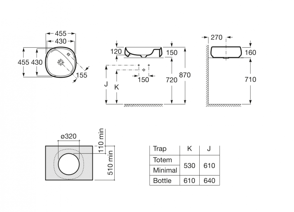 1) раків на для ванної накладна Roca Beyond 45.5х45.5 з отвором під змішувач FINECERAMIC біла