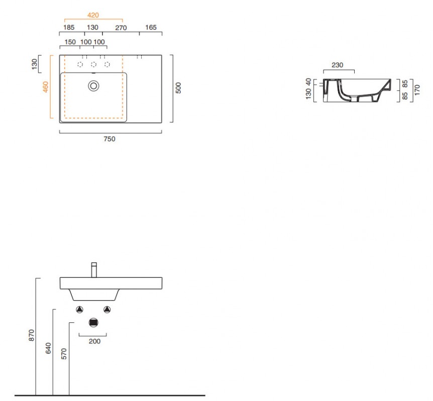 • намічено 3 отвори для змішувача біля чаші