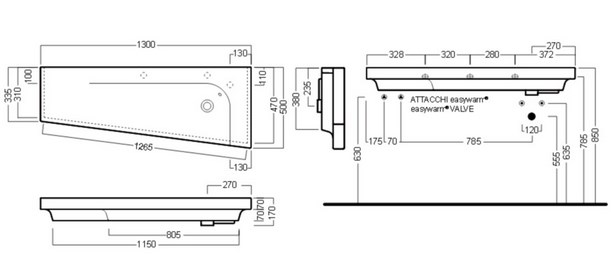 1) Раковина для ванної підвісна Hatria Grandangolo полку зліва 130х50 см білий