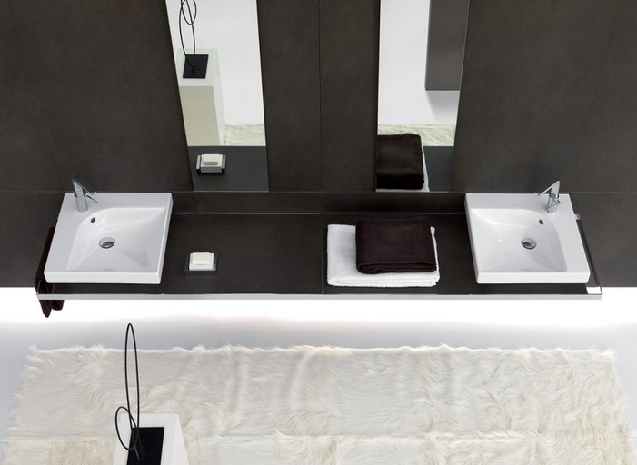 Вироби мають варіації бортів: від вузьких до перехідних в поличку для банних аксесуарів. Колекція GRANDANGOLO також доповнена окремими кутовими поличками.