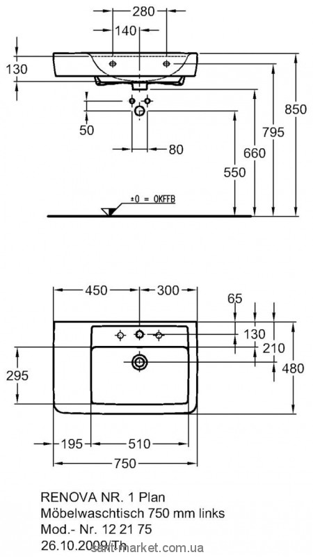 Keramag Renova Nr. 1 Plan F122175000 раковина асиметрична підвісна для ванної кімнати з полицею з лівого боку, з отвором під змішувач та переливом, 750 х 480 мм. Колір білий. Комплектується з напівп'єдесталом арт. F292110. Ціна вказана лише за раковину.