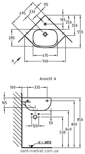 Кутова раковина keramag має один отвір під змішувач. Призначена для навісної установки. Також кутова раковина Keramag 500 може мати спеціальне покриття Keratect, що захищає від забруднень та надовго зберігає початкову яскравість кольору. На вироби із покриттям гарантія складає 30 років. Сифон для раковини замовляється додатково.