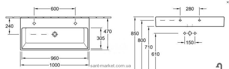 Раковина для 3-позиційного змішувача, центральний отвір для змішувача вибито