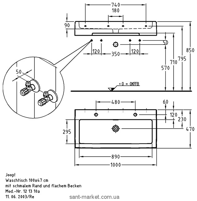 Керамічна раковина Keramag JOOP 121310 прямокутної форми. Розміри: 1000x470 мм. Монтаж на кронштейнах. Перелив. Отвір під змішувач. Вага: 33.5 кг.