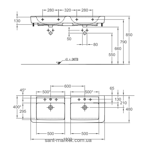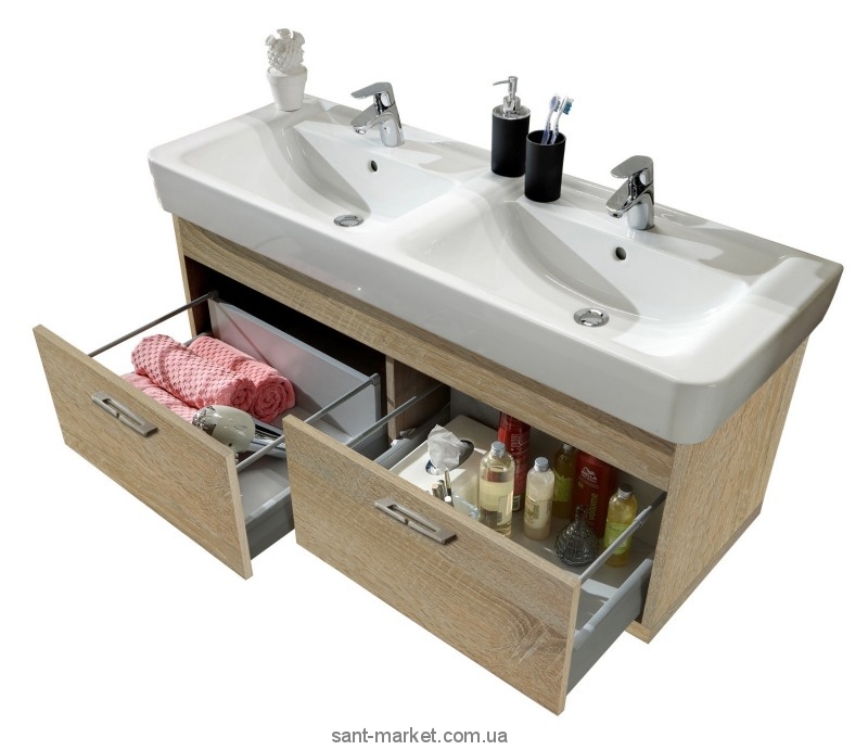 Кераміка вага 41 кг; ДхШ: 1300 х 480 мм; два отвори під змішувач, два отвори для переливу; можлива комплектація напівп'єдесталом.