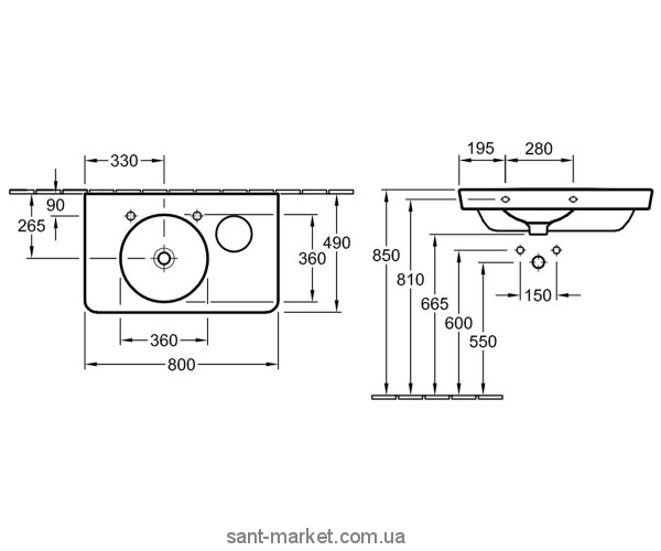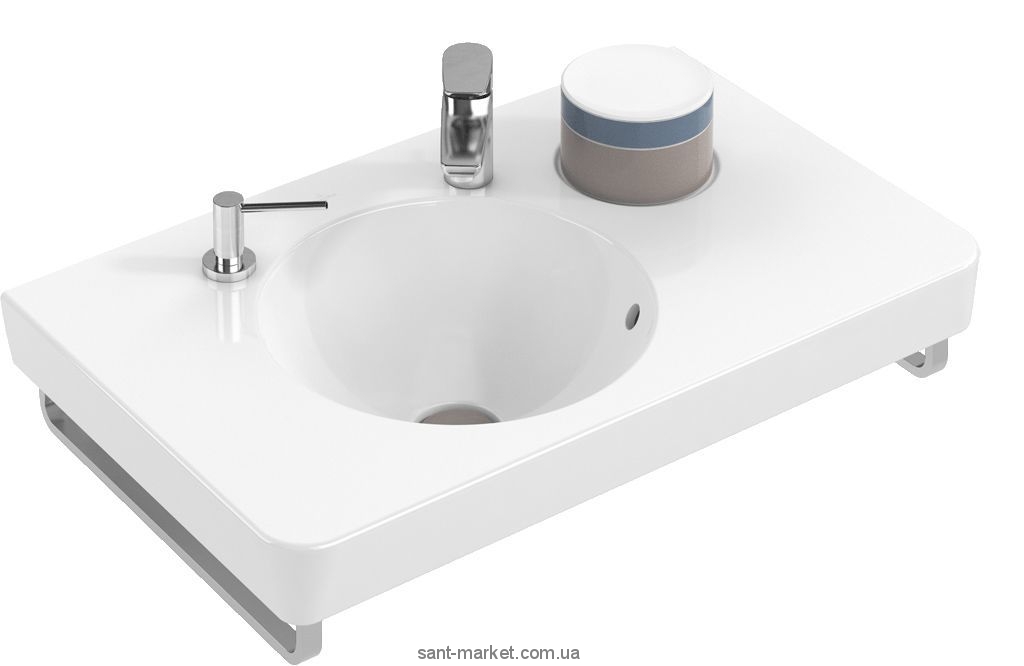Умивальник Villeroy&Boch Joyce 41078101 цікавий своїм дизайном: у ньому передбачена поличка для аксесуарів. Буває два види такого умивальника. Цей отвір під змішувач для умивальника розташований праворуч.