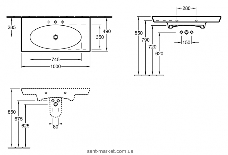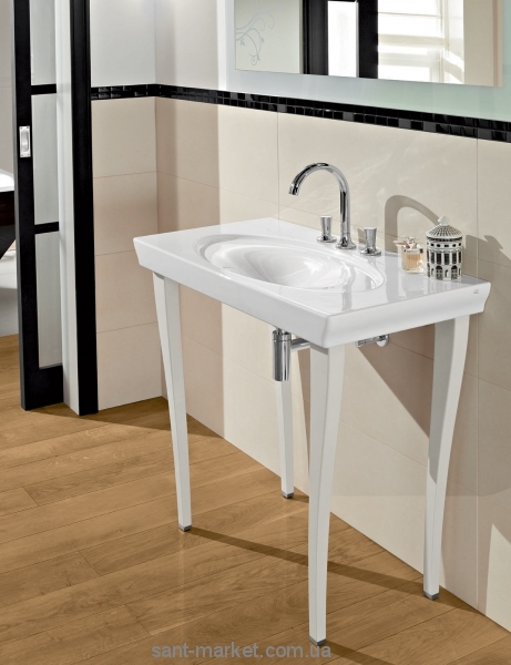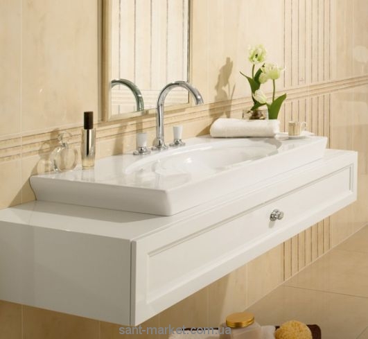 Раковина Villeroy&Boch La Belle (6124G1R1) для тумби або стільниці; розмір 100х49 см; 3 отвори для змішувача; без переливу; зливний клапан з керамічною декоративною кришкою; кріплення 2 болтами M12x120 мм; можлива комбінація з тумбами Villeroy&Boch La Belle (A58210DU), Villeroy&Boch La Belle (A58310DU)