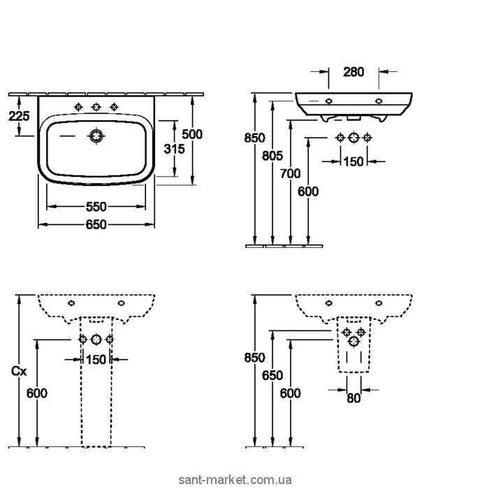 Для 3-позиційного змішувача. Центральний отвір для змішувача вибитий. Рекомендовані змішувачі - Villeroy & Boch Cult та Square Vogue. Матеріал – санфарфор. Також пропонується з ceramicplus. Кріплення 2 болтами M10x120 мм. Підходяща меблева програма SENTIQUE.
