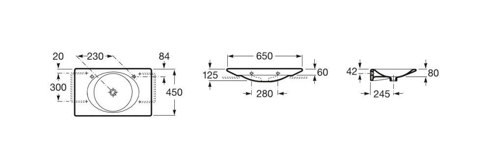 1) Раковина для ванної підвісна / в різьблена Roca Kalahari 65х45 см з отвором для змішувача справа кераміка біла