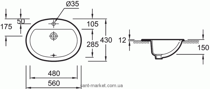 Тип монтажу: врізний у стільницю; матеріал: кераміка; форма: овальна; з переливом; є отвір під змішувач; комплектація: чаша (умивальник); колір білий; габарити (мм): 560х430х195;