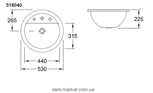 Врізна у стільницю раковина Villeroy & Boch Loop & Friends 51804001 має круглу форму з діаметром 440 мм. Призначена для 3-позиційного змішувача. Має центральний отвір під змішувач та отвір під перелив.