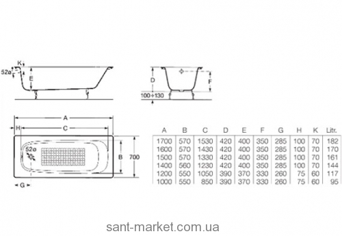ROCA A21291200R Ванна Continental 1600х700 мм, глибина 420 мм, місткість 170 л. Емальована чавунна ванна