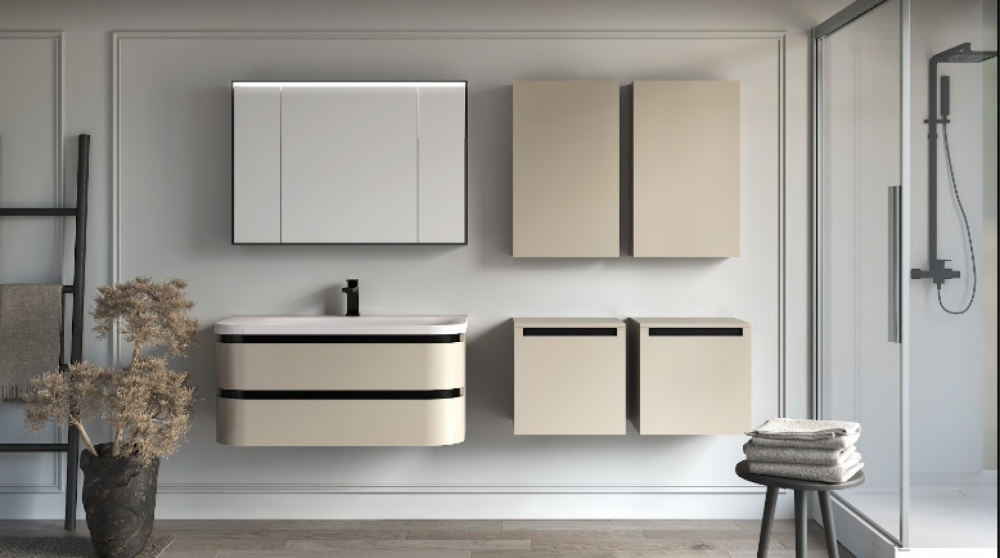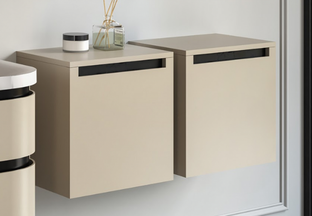 Vittoria представлена у трьох одноколірних декорах – білому, бежевому та темному. Відчуття гламуру додатково підкреслюється лакованими лицьовими сторонами елементів. Для більш просторих ванних кімнат пропонуємо шафиподвійна ширина з м'яким закриттям, стильно доповнена частково інтегрованими ручками.